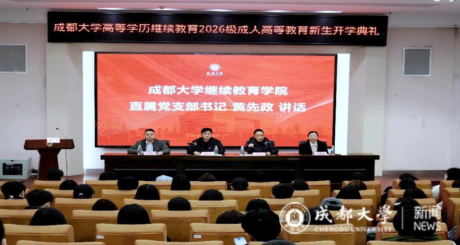 3月14日上午,继续教育学院在学校博物馆报告厅隆重举行成都大学高等学历继续教育2026级成人高等教育新生开学典礼。继续教育学院直属党支部书记黄先政、直属党支部副书记张隽、副院长应会琼,学院学生科、成人教育科负责人及工作人员,二级学院教师代表、教学点负责人及2026级新生参加了开学典礼。开学典礼由直属党支部副书记张隽主持。