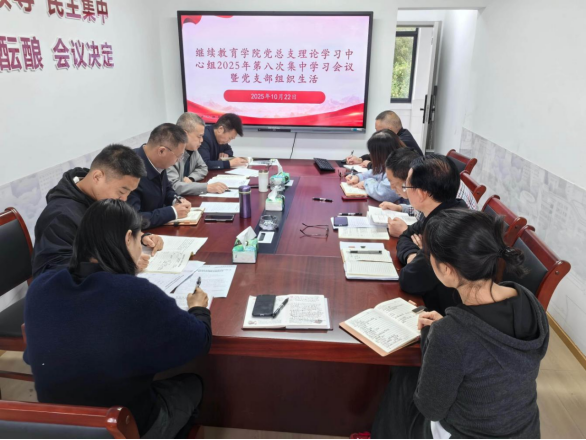 2025年10月22日上午,继续教育学院党总支在第三行政办公楼506会议室召开理论学习中心组2025年第八次集中学习会议暨党支部组织生活。会议由党总支书记夏达主持,学院党总支理论学习中心组成员、党总支委员、教职工党员参加了此次会议。