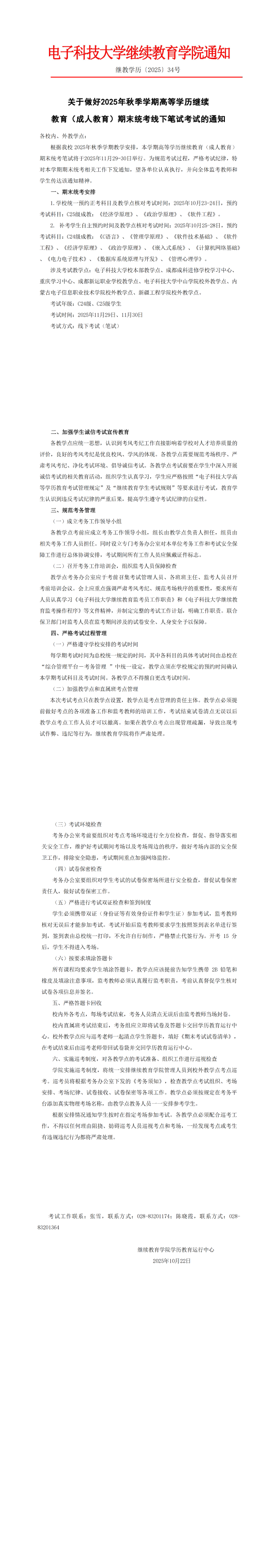 电子科技大学继教学历〔2025〕34号-关于2025年秋季学期成人高等学历教育期末统考笔试考试通知