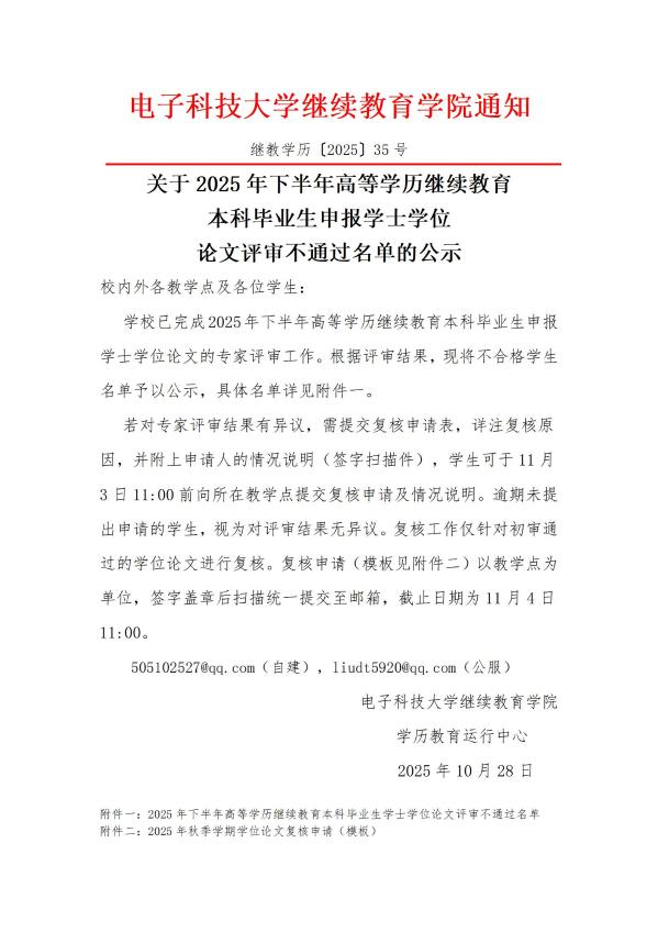 继教学历〔2025〕35号-关于2025年下半年高等学历继续教育本科毕业生申报学士学位论文评审不通过名单的公示