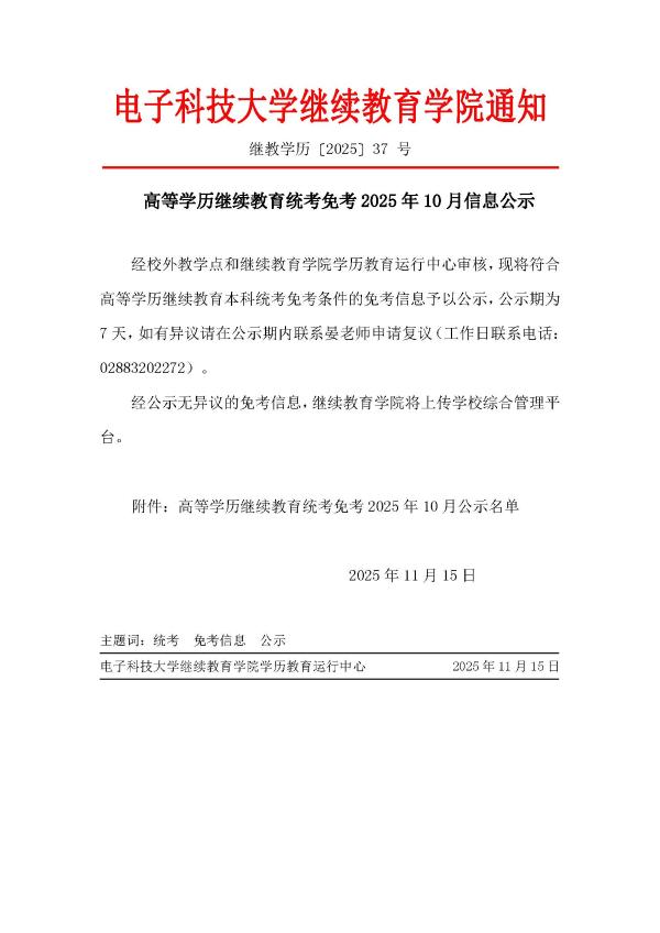 继教学历〔2025〕37号-高等学历继续教育统考免考2025年10月信息公示