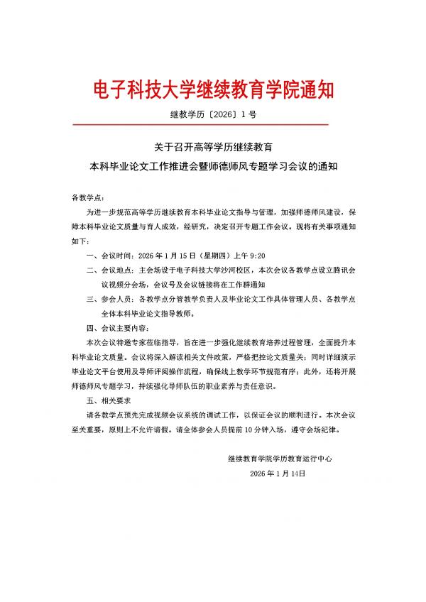 继教学历〔2026〕1号关于召开高等学历继续教育本科毕业论文工作推进会暨师德师风专题学习会议的通知