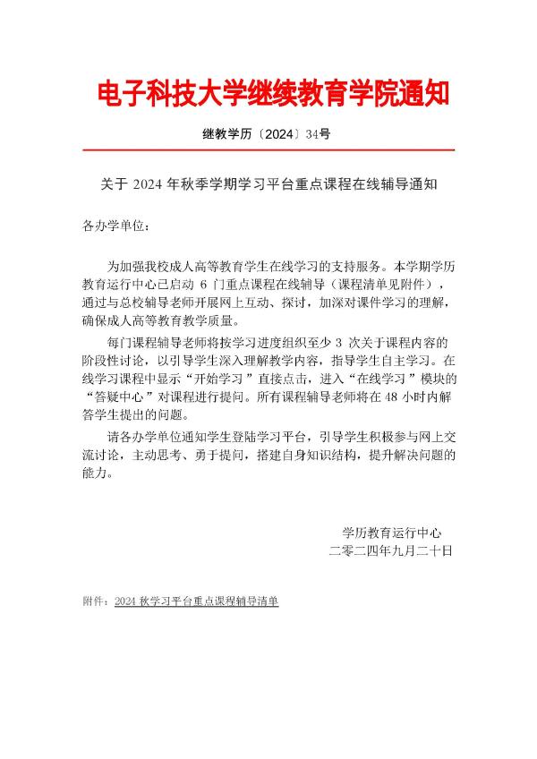 继教学历202434-关于2024 年秋季学期学习平台重点课程在线辅导通知