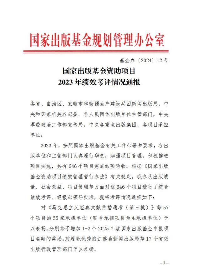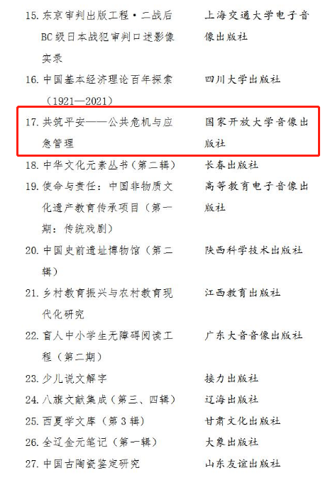 近日,国家出版基金规划管理办公室发布国家出版基金资助项目2023年绩效考评情况通报,由国家开放大学品牌资源项目“名师好课”孵化的出版作品《共筑平安——公共危机与应急管理》,以综合绩效考评“优秀”的成绩,在全国646个已结项的项目中脱颖而出,获通报表扬。据悉,本次考评由国家出版基金规划管理办公室组织实施,考评维度涵盖出版质量、社会效益、项目管理等方面,全国仅57个项目获此殊荣。