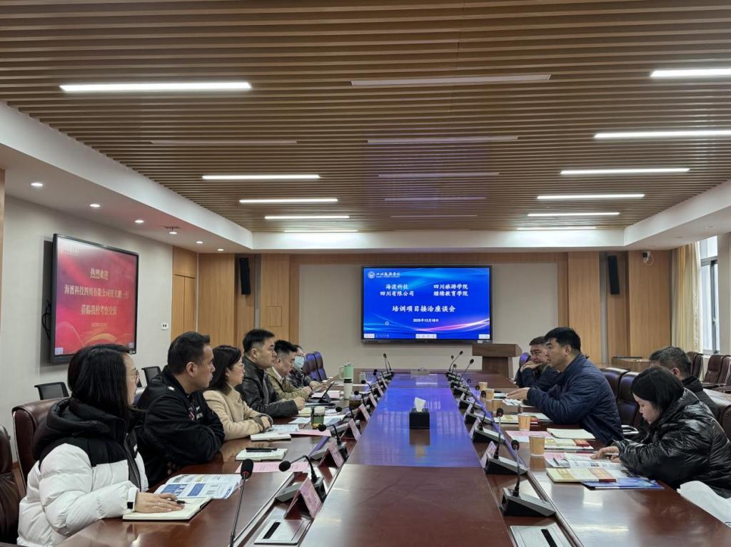 川旅新闻网讯(通讯员 李林洋)12月18日上午,在产教融合大楼514会议室,四川旅游学院继续教育学院与海渡科技集团开展培训项目接洽会,海渡科技四川有限公司总经理任大鹏一行出席会议。四川旅游学院继续教育学院书记郑强、副院长李兴华、综合办公室主任吕莉、培训鉴定科科长梁峰及相关业务人员参会。会议由郑强主持。