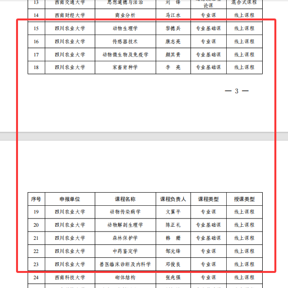 此次入选的课程,深度植根于动物科学、动物医学、林学、药学、信息工程等学校的传统优势与新兴交叉学科,形成了特色鲜明的“金课”集群。其中,《动物生理学》《动物微生物及免疫学》《兽医临床诊断及内科学》《动物传染病学》及《动物解剖生理学》等课程,构筑了坚实的动物医学类专业基础与临床核心课程群,紧密对接执业兽医资格考试要求,将前沿科研成果与一线临床案例深度融合。《家畜育种学》课程则直面国家“种业振兴”战略需求,以学校自主培育的“天府”系列新品种为鲜活教材。《森林保护学》课程服务生态文明建设,《中药鉴定学》课程助力中医药传承创新,而《传感器技术》课程则体现了工学与农学的交叉融合,共同展现了学校课程体系的前沿布局与时代特色。