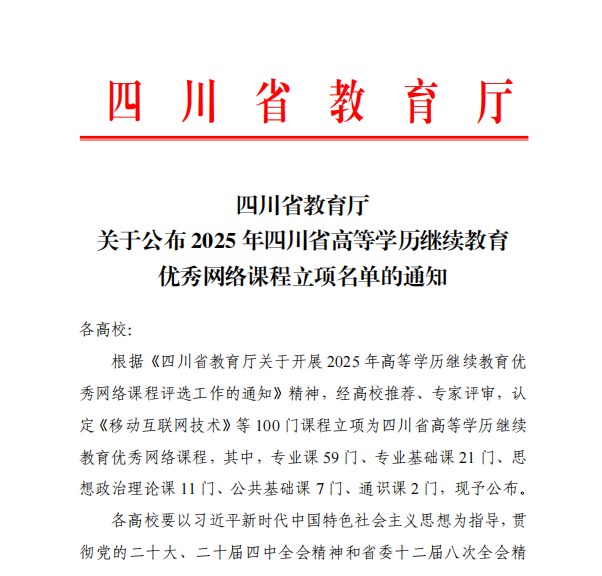近日,四川省教育厅正式公布了2025年四川省高等学历继续教育优秀网络课程立项名单。在全省严格评审并最终立项的100门优秀课程中,我校9门课程成功入选,涵盖农、工、理等多个学科门类,入选总数位居全省高校前列,体现了我校在高等学历继续教育领域深化教学改革、推动数字化转型的卓越成效与领先地位。