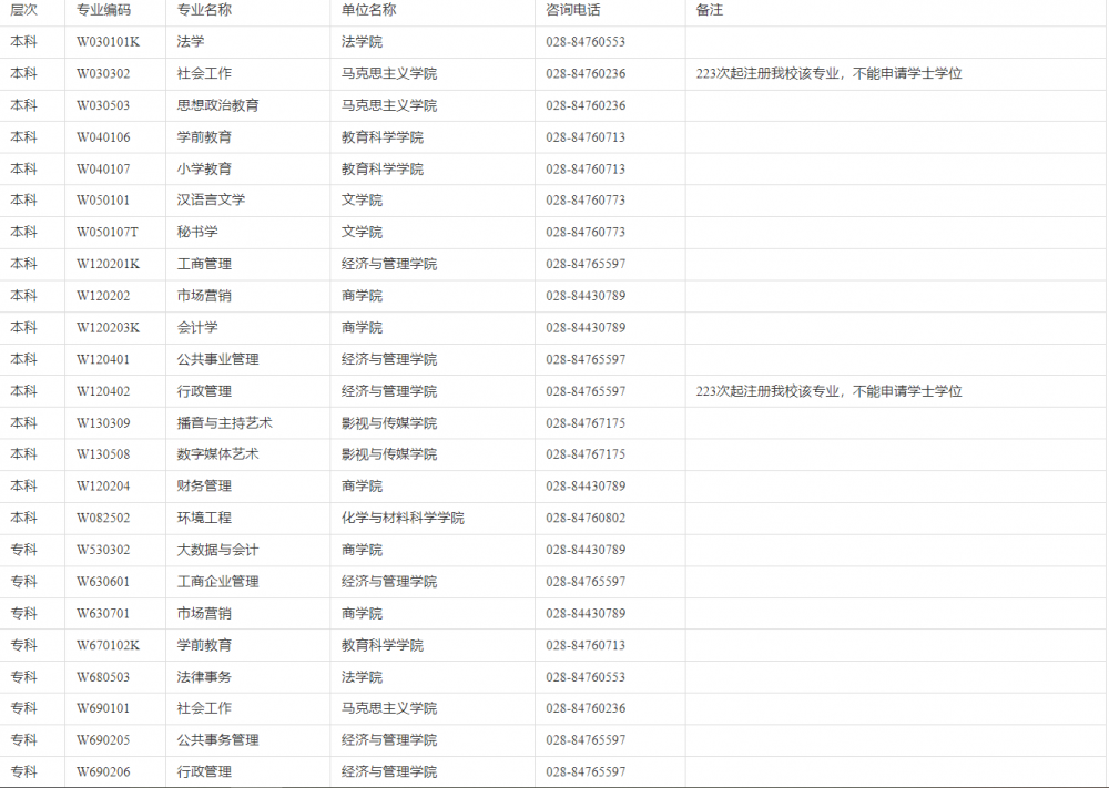 四川师范大学高等教育自学考试(253次注册、254次注册)举办专业表