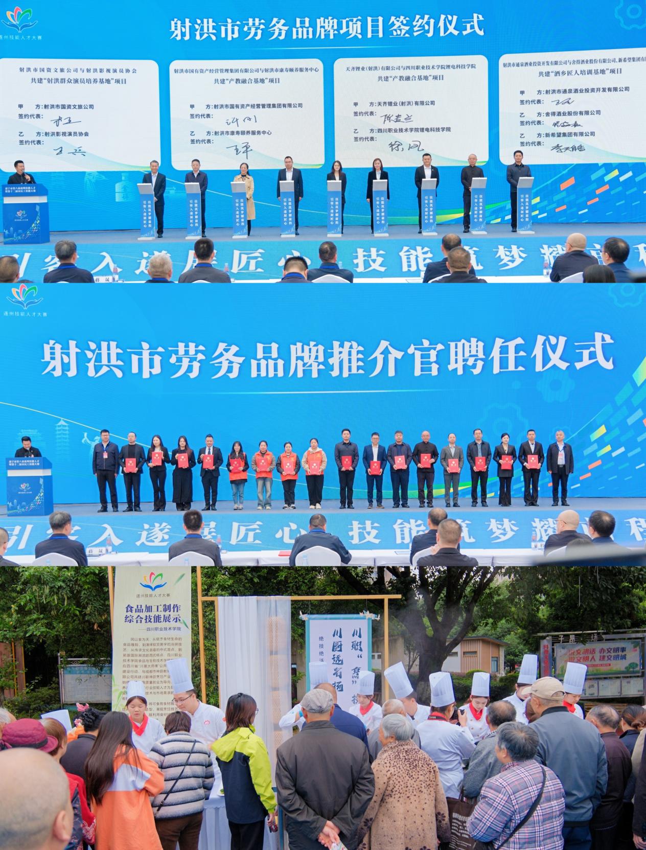 大赛期间,学校收获重大合作成果,同步推进产教融合、校地合作等重点工作。一是深化校企协同,党委委员、副校长徐凤同志代表学校与天齐锂业(射洪)有限公司完成签约,为锂电产业人才培养搭建更紧密的合作桥梁;二是赋能地方发展,四川职业技术学院射洪锂电学院陈德航副院长被聘为射洪劳务品牌推荐官;三是展示育人成果,食品与生物技术学院现场布展,通过食物雕刻、中西式面点制作等技能展演,生动展现了学校实践教学成效。活动期间,徐凤副校长陪同遂宁市人民政府副市长徐建军、遂宁市人民政府副秘书长罗红光、射洪市市委副书记、市长王能、遂宁市人社局党组书记、局长蒋晟、遂宁市人社局党组副书记、农民工服务中心主任程康等领导参加了大赛开幕式并巡赛巡展,相关领导对学校在赛事承办、技能人才培养及校地合作方面的工作给予高度评价。