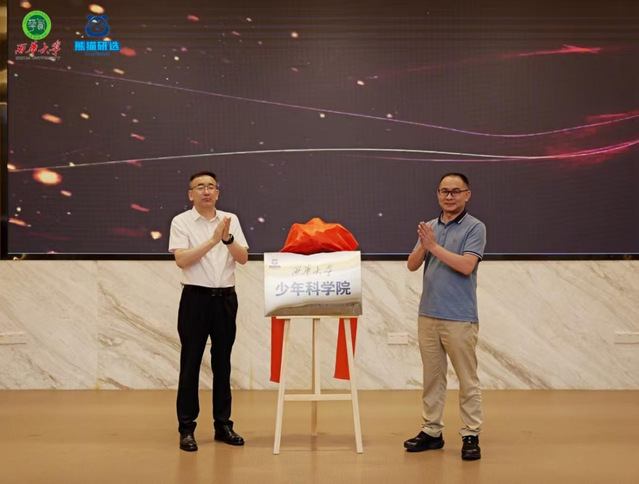 研讨会的重要环节——“西华大学少年科学院”授牌仪式。该学院由西华大学继续教育学院与四川熊猫研选文旅联合“中国芯”白名单赛事组委会共同发起,旨在打造面向青少年的科创训练营项目,聚焦通信科技、人工智能等前沿领域。继续教育学院院长刘浏与组委会负责人廖楠共同为少年科学院揭牌。未来,学院将通过赛事培训、课题研究等多种形式,系统提升青少年的科技素养与创新能力。
