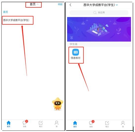 登录成功点击【首页】点击上方【首页】按钮切换至【西华大学成教平台】,点击【信息核对】