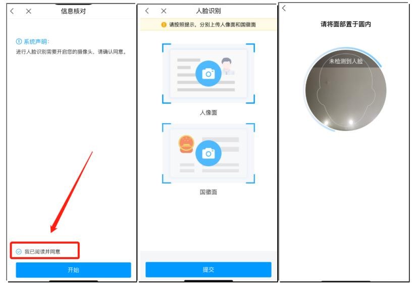 七.人脸识别勾选已阅读并同意,上传证件照,进行人脸采集并核对