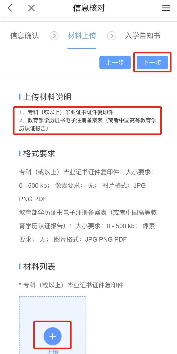 五.材料上传按照格式要求,上传材料说明里要求的两个文件,点击+选择文件,上传成功后点下一步