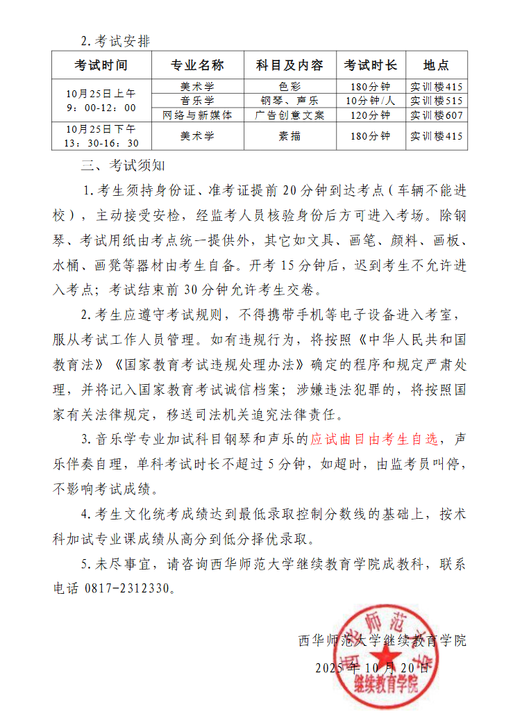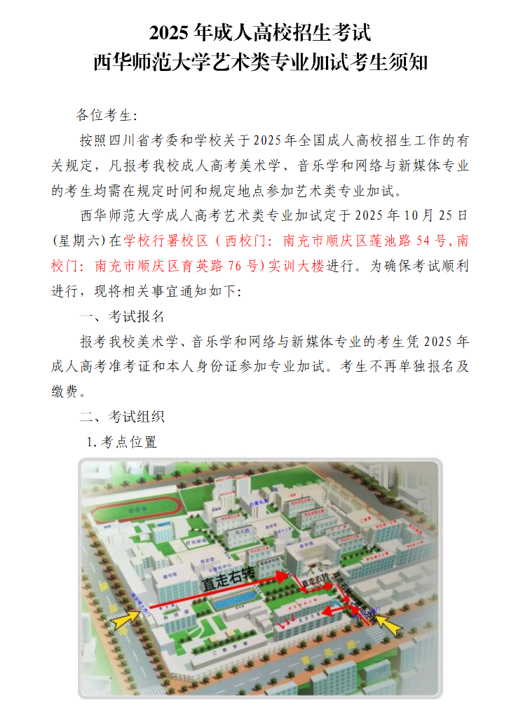 2025年成人高校招生考试西华师范大学艺术类专业加试考生须知