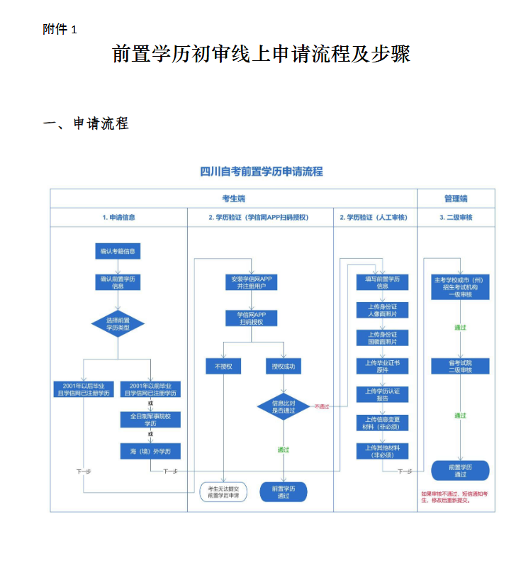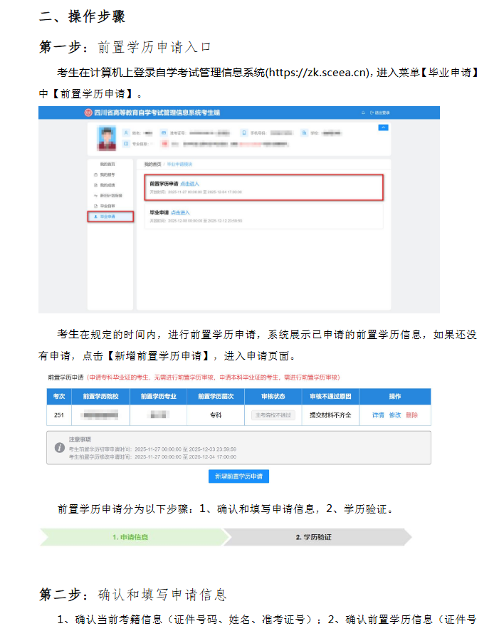 考生登录四川省高等教育自学考试管理信息系统(网址: https://zk. sceea.cn,以下简称信息系统)。(1)提起申请,正确选择系统内给出的前置学历类型(申请类型选择错误将会被驳回),录入本人在中国高等教育学生信息网(网址: http://www. chsi. com. cn,以下简称学信网)注册的实际前置学历信息(证件号码与姓名) ,系统将根据考生所录信息生成考生个人专属学历查询二维码。(2)扫码验证,考生需先安装学信网手机端APP并注册个人账号,使用学信网手机端APP登录账号扫描系统生成的二维码,即可查询到本人学信网账号下的所有学历信息。(3)选择授权,考生选择并点击学信网账号内显示的学历信息,即完成前置学历的授权。