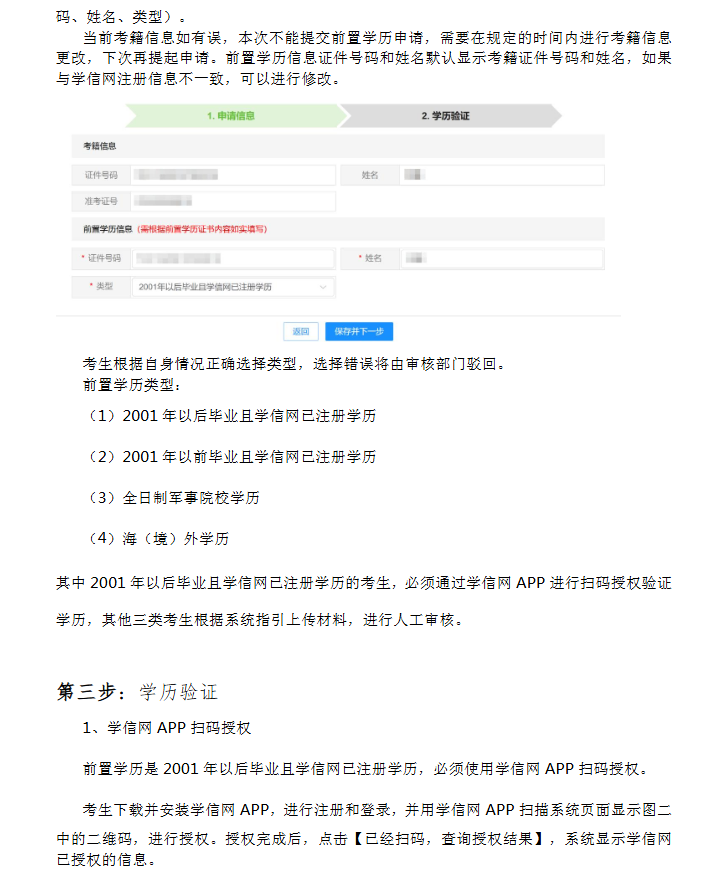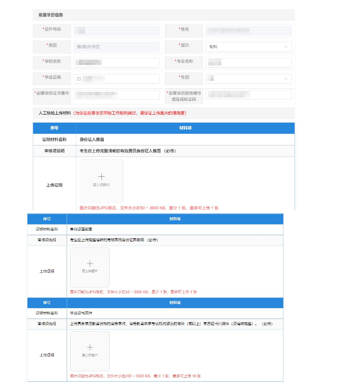 ●特别提醒: 2001年以前毕业的学历、全日制军事(部队)院校学历、海(境)外学历三种类型考生的前置学历身份信息与我省考籍库内身份信息一致性的校验,将上报学信网进行,我省初审阶段只对这类考生上传的证明材料是否齐全进行人工审核。
