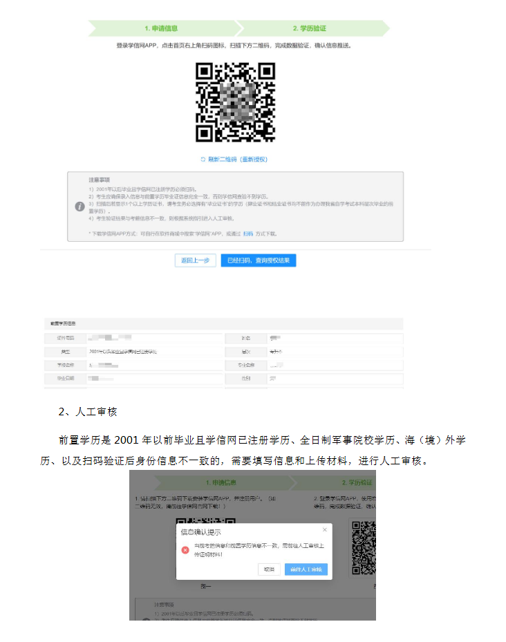 三、考生本人的学信网账号有学历信息,但前置学历注册的证件信息与考生现身份证信息不一致此类考生扫描学信网二维码,前置学历验证成功后,学信网推送的身份信息与我省考籍库身份信息校验不一致,系统提示并指引考生进入人工审核界面,上传相关证明材料。