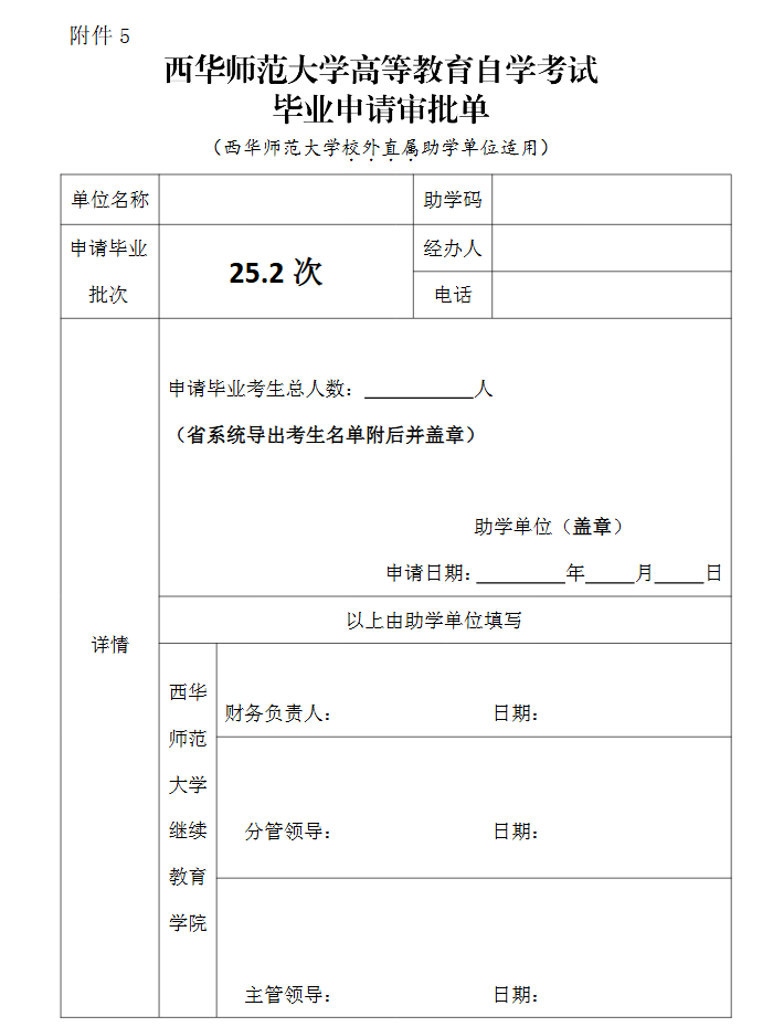 (二)助学点于12月16日(含)前将《西华师范大学高等教育自学考试毕业申请审批单》(附件5)纸质版和毕业申请考生名单纸质版(信息系统导出打印并盖章)这两项材料面交西华师范大学自考办并签字确认,所有纸质材料均不接收邮寄。