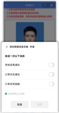 (4)照片初审。在拍摄完成或上传完成后,系统会生成带水印的初审照片,显示初审合格点击下一步,会弹出通知权限请求,请务必允许小程序发送审核结果、订单状态、订单异常提醒通知,避免对采集工作造成不必要的影响。