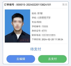 (6.1)采集订单支付成功,会进入订单列表已支付完成未审核订单显示为待审核,若支付未完成中途退出会显示待支付,学生可点击去支付继续支付订单。
