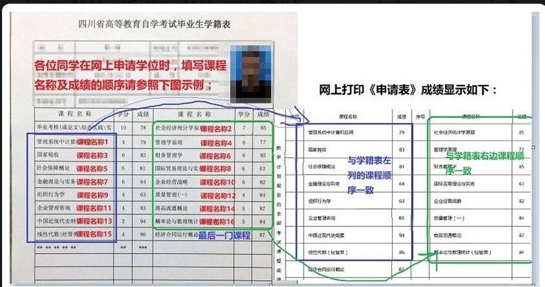 (三)自考毕业生网上申请时,需要在“其他信息填写”中自行填报课程名称及成绩,为保证最后网上打印的《学位申请表》中课程顺序符合要求,请务必按下图所示顺序填报: