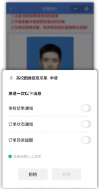 (4)照片初审。在拍摄完成或上传完成后,系统会生成带水印的初审照片,显示初审合格点击下一步,会弹出通知权限请求,请务必允许小程序发送审核结果、订单状态、订单异常提醒通知,避免对采集工作造成不必要的影响。