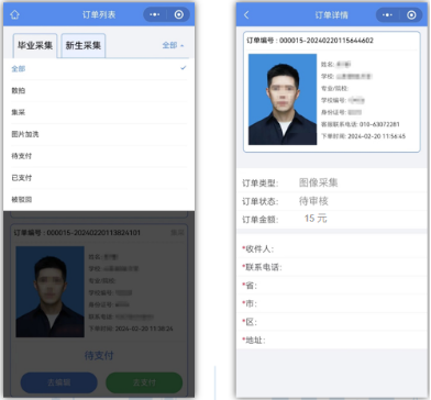 (6.1)采集订单支付成功,会进入订单列表已支付完成未审核订单显示为待审核,若支付未完成中途退出会显示待支付,学生可点击去支付继续支付订单。