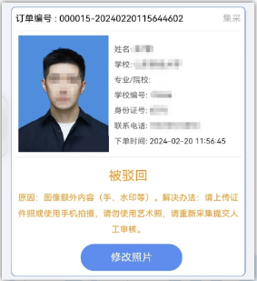 6.关于人工审核。支付完成后请同学关注个人订单页面,后台将在7个工作日内对采集的图像进行人工审核,如图像不符合采集标准,后台会驳回并给出重拍意见,同学可点击修改照片重新上传。