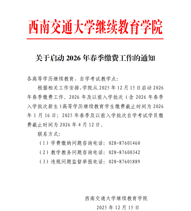 西南交通大学继续教育学院关于启动2026年春季缴费工作的通知