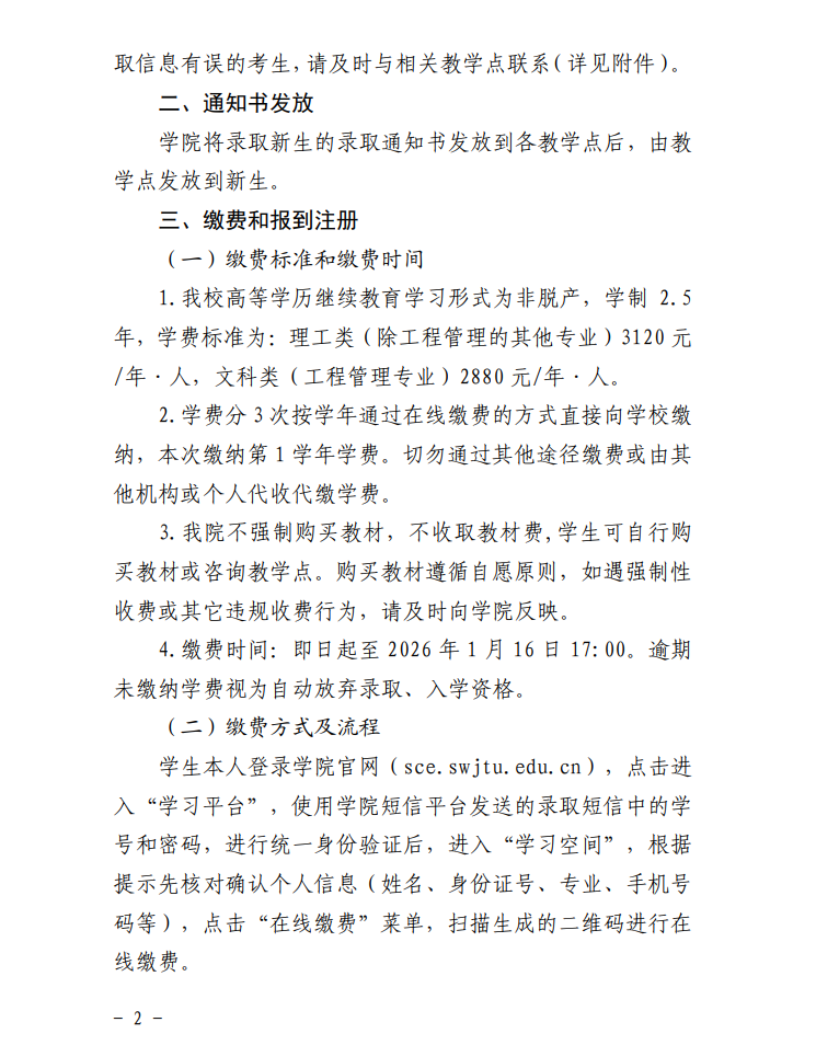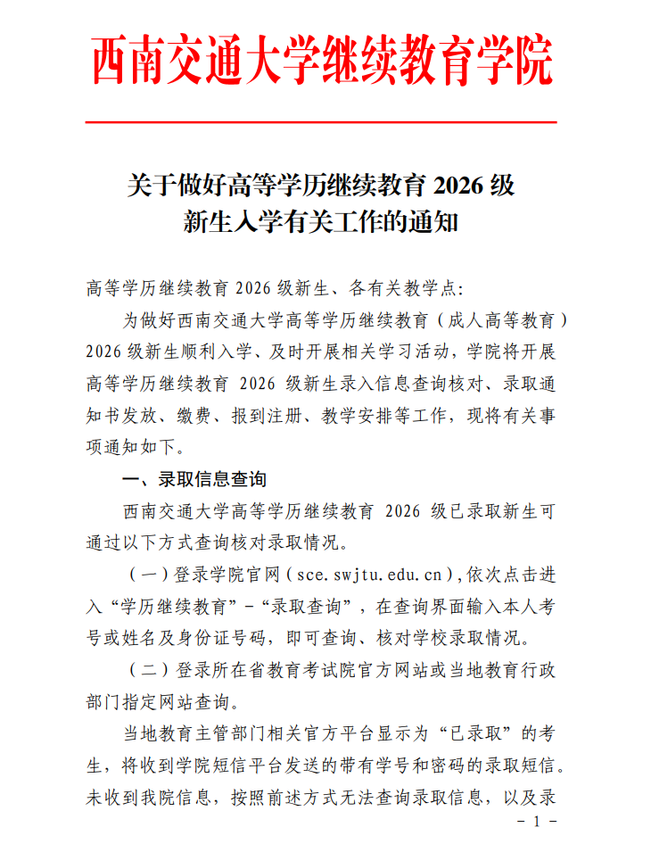 西南交通大学继续教育学院关于做好高等学历继续教育2026级新生入学有关工作的通知
