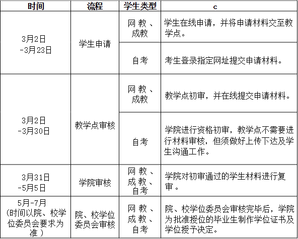 本次学士学位申请工作受理我校于2024年3月1日及以 后毕业的网络教育、成人教育及高等教育自学考试本科毕业生 提出的学位申请。
